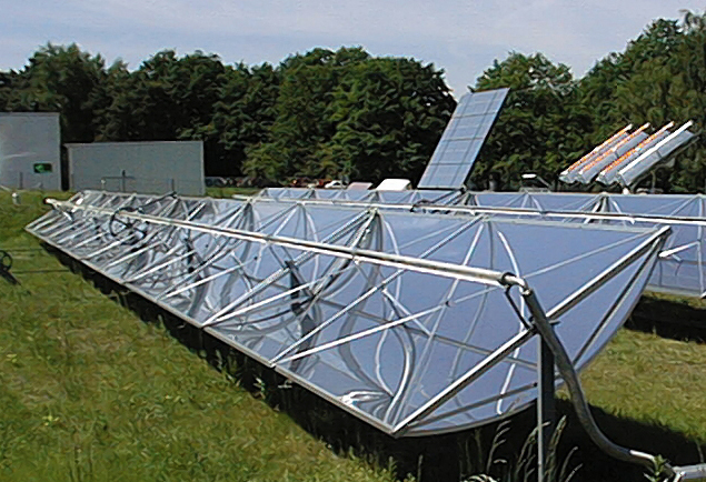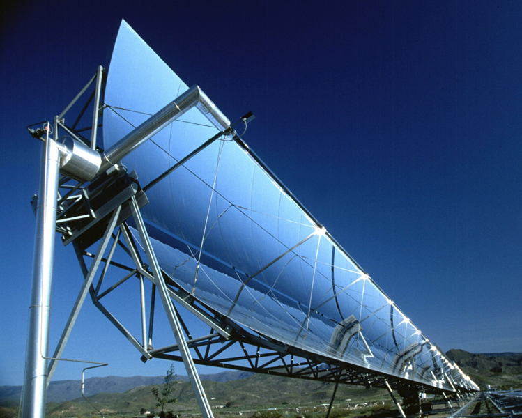 | Parabolischer Solar-Rinnen-Konzentrator eines Solar-Thermal-Kraftwerks. (Bilder mit freundlicher Genehmigung von DLR-Köln.) |